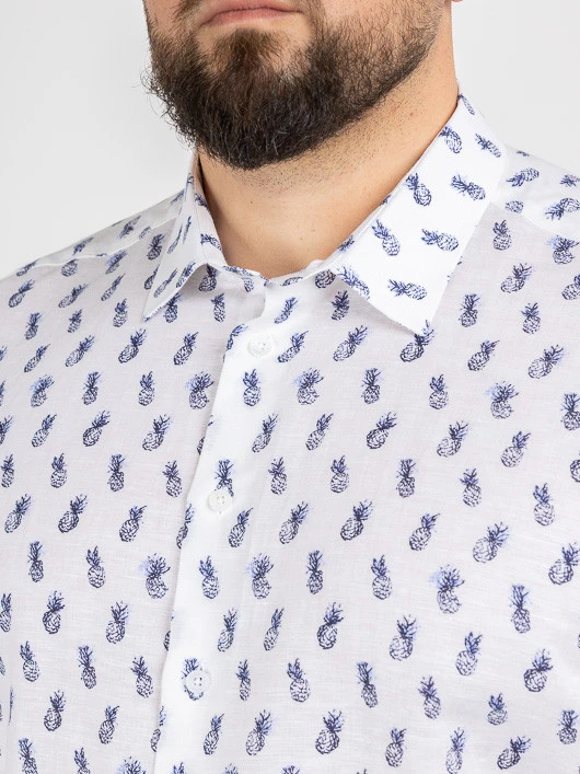 Cette chemise en coton et lin à motif ananas apporte confort et respirabilité grâce à son tissu léger idéale pour un look à la fois décontracté et raffiné.
