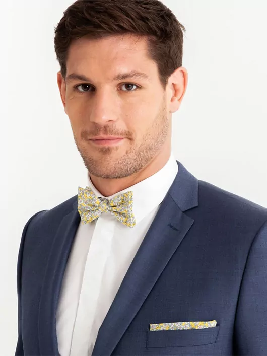 Cette pochette est faite dans un tissu Liberty 100% coton. Son coloris jaune réhaussera votre tenue et s’associera à merveille avec tous les bleus. N’hésitez pas à l’assortir avec le noeud papillon fabriqué dans le même tissu pour encore plus d’élégance !